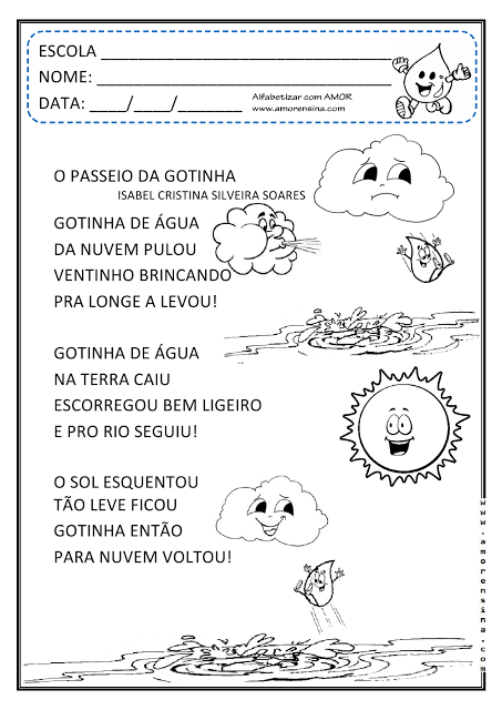 Leitura do poema: O PASSEIO DA GOTINHA.Seleção das vogais e das consoantes por meio de pintura.